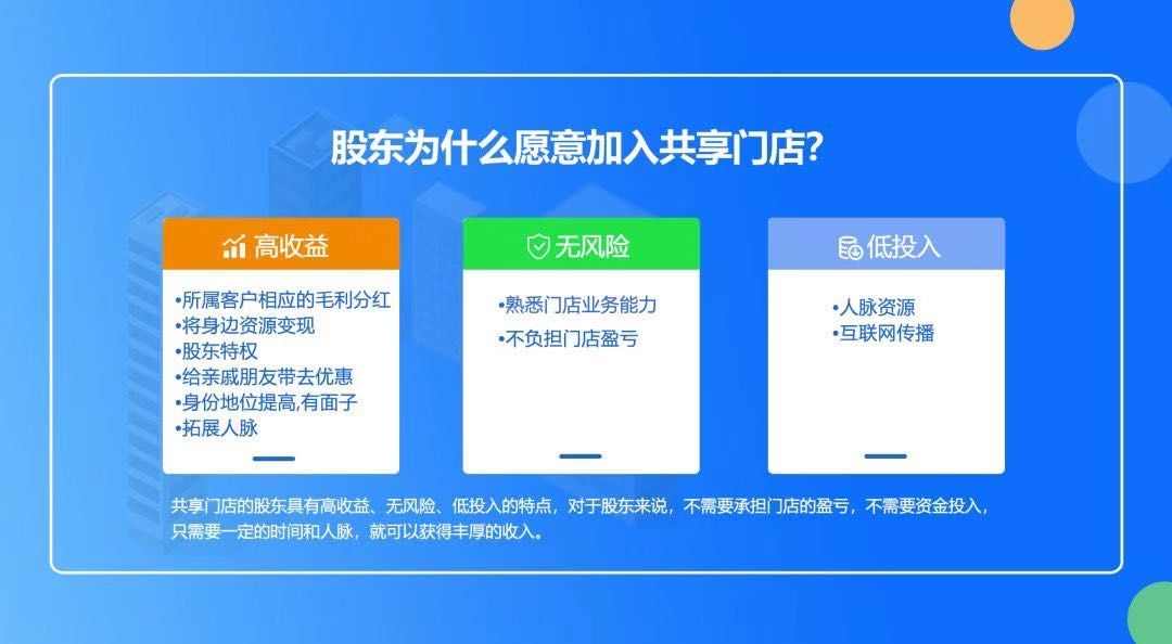 共享股东并不参与门店管理,不会存在多位领导人意见不合的现象。实体店永远不会倒闭,只有管理不善的实体店才会倒闭。其中,员工管理极其重要,对实体店来说,员工一旦离职、跳槽,随之会带走大量客源,但是共享门店后,员工也可以成为共享股东,参与股东分红,让员工不再是给老板打工,而是给自己打工。