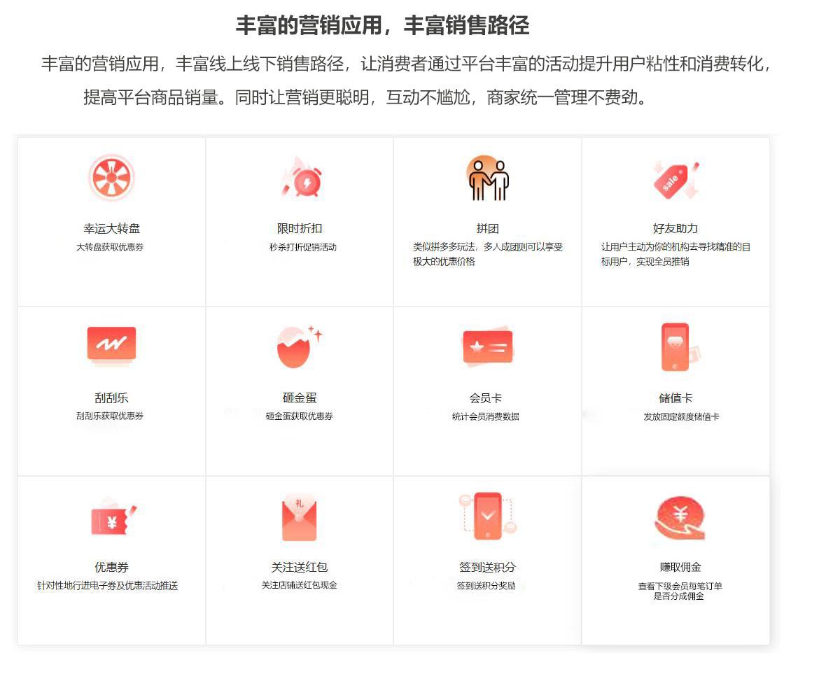 分销商城还可以内置微信红包、大转盘营销工具、刮刮乐等几十种火爆的微信粉丝互动营销吸粉活动。活跃潜在客户!